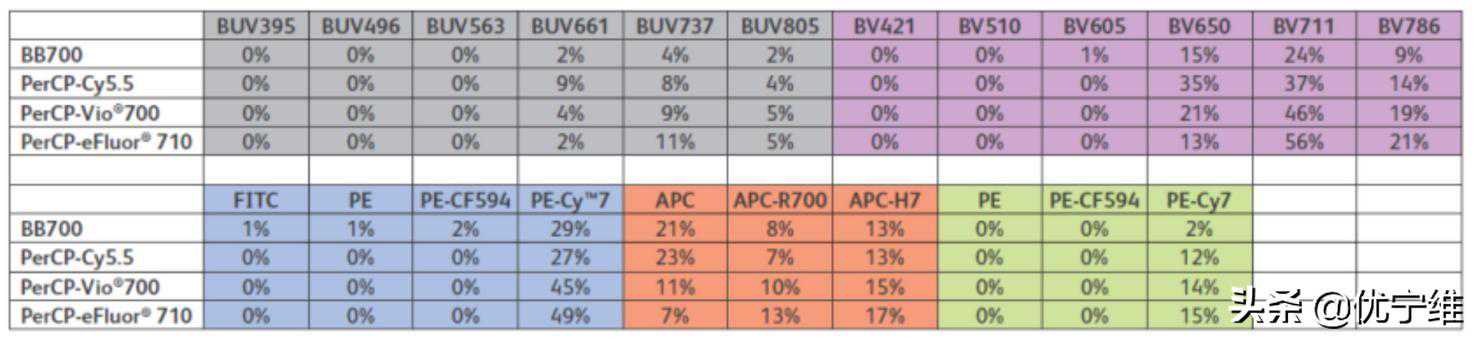BB700和、PerCP-Vio700、PerCP-eFluor710对于其他通道spillovervalues的对比,整体补偿明显小于其他三种荧光。
