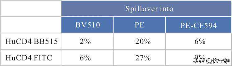 在BDLSRFortessa系统上分析了用人CD4BB515或FITC染色的全血样品,并在BV510,PE和PE-CF594检测器中测量了溢出。该表旨在显示染料之间的相对比较,因为获得的溢出值可能会根据所使用的过滤器和PMT电压而变化。
