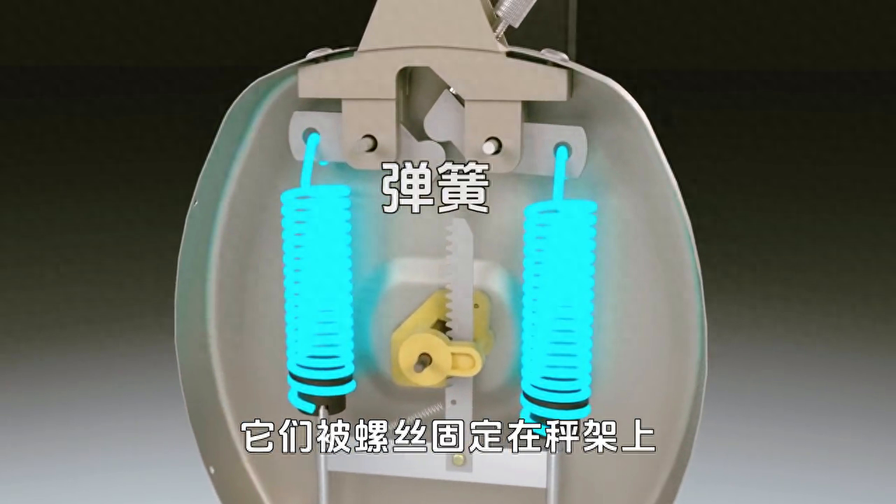 吊秤的内部最明显的就是两根大弹簧,它们被螺丝固定在秤架上,中间一块叫做齿条,隐藏在里面的是小齿轮。小齿轮的中心穿过表盘,连接着红色指针。在它的边上还有一个小弹簧,作用是让机架始终靠在小齿轮上。当重物挂在吊钩上时,弹簧带动齿条下垂,进而带动齿轮和指针转动,从而显示出物体的重量。