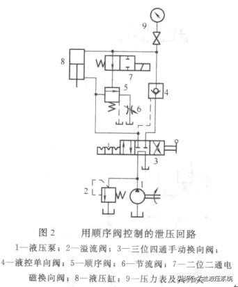 图2所示为用顺序阀控制回程压力实现泄压的回路。上腔没有泄压,压力油经二位二通换向阀7将顺序阀5打开,液压泵1进入缸下腔的油液经顺序阀5和节流阀6回油箱,调节节流阀6的开度,使缸下腔压力在约2MPa还不足以使活塞回程,但能顶开液控单向阀4的卸荷阀芯,使上腔泄压。当缸上腔压力降低至小于顺序阀5的调压值(通常为2~4MPa),顺序阀5关闭,切断泵1至油箱的低压循环,泵1压力上升,顶开液控单向阀4的主阀芯,活塞回程。二位二通阀7是为了保压过程中切断顺序阀5的控制油路,保证回路的保压性能。