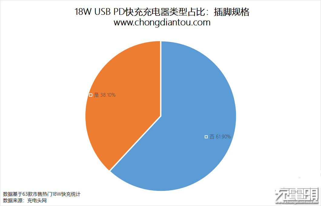 而可折叠插脚充电器占比38.1%,固定插脚充电器占61.9%。可见18W充电器更多是以居家日常充电为主,设计成可折叠插脚充电器考虑的是便携,18W充电器携带出门意义不大。