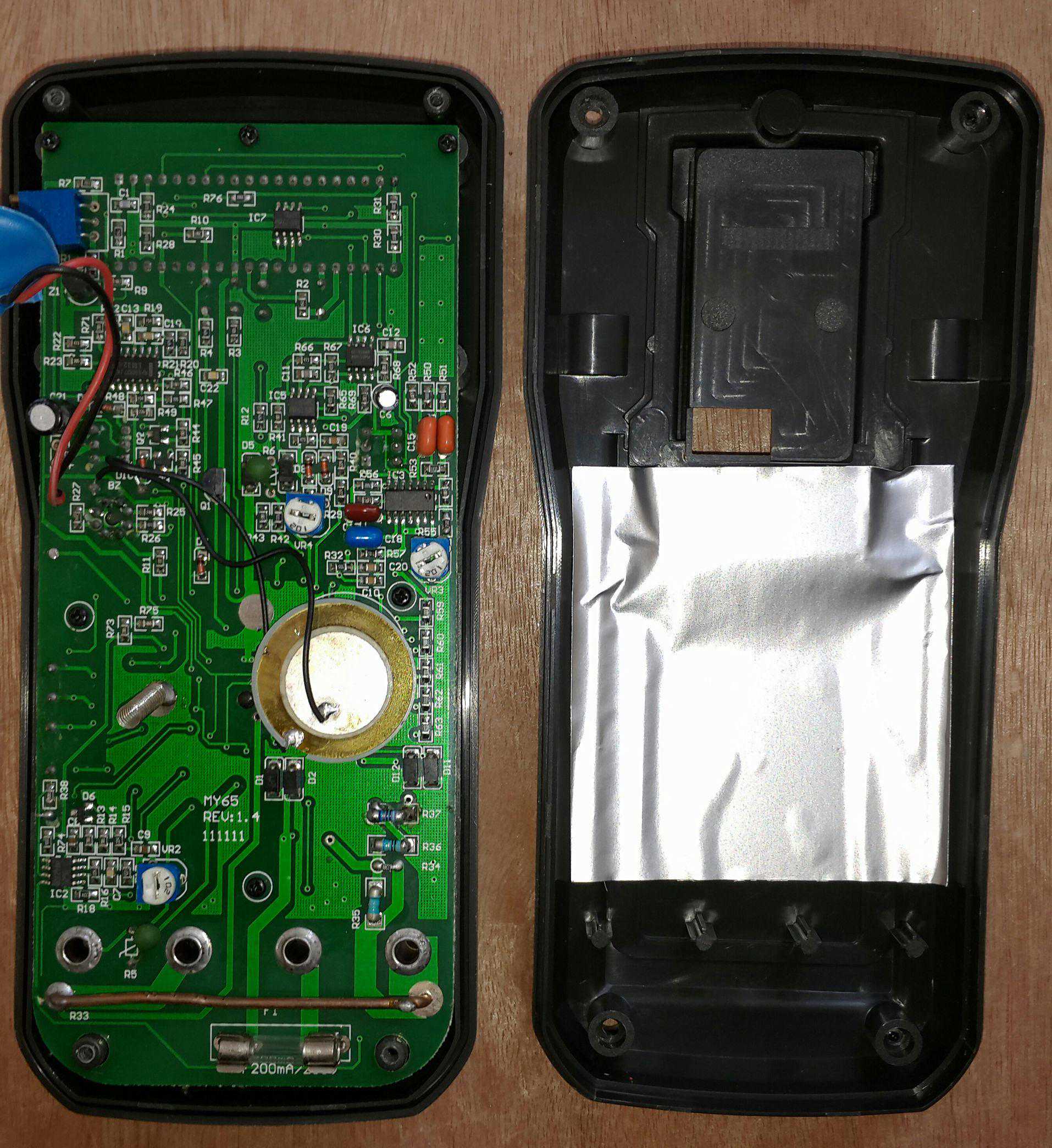 拆开后盖的样子,可以看到主电路板了;后盖上贴有一层金属铝皮,用来防止外界电磁场对仪表造成干扰。