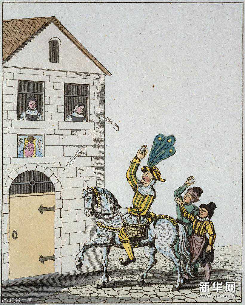 插画,德国,街上的狂欢者们向人们投掷食物的场景。