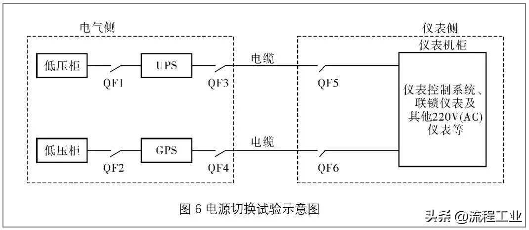 电源方面的另一个问题是220V(AC)单电源供电的联锁仪表设备,应保证在这路电源中断后所在装置不会跳车。虽然在石化厂中,大部分仪表设备已经按220V(AC)双路供电配置或直流电源进行了供电,但一些仪表设备,如就地机组控制器、分析表、射线料位计往往是单220V(AC)电源供电的,对于这些设备应进行识别,对于单电源中断后会造成装置跳车的,则应进行改进,为确保识别工作全面不遗漏,在大检修期间应做电源切换试验,如图6所示。首先拉开电气侧GPS输出电源QF4,仪表控制系统运行正常,恢复送电;拉开UPS输出侧开关QF3,仪表控制系统运行正常,恢复送电;拉开GPS输出侧电源QF4,同时拉开UPS输入侧电源QF1,仪表控制系统运行正常,恢复送电。