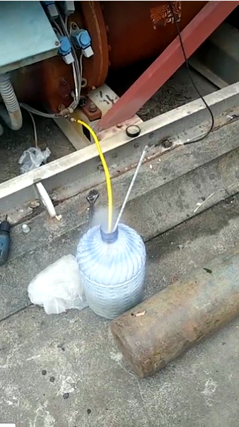 ④.再把原来的冷冻油放出来,如果系统较脏,油会变黑,放完后用高低压阀放氟再冲洗系统,反复倒油冲洗,直至流出干净的冷冻油即可,油的位置在三分之二处为标准。保压完成后,抽真空10小时,注入标称的制冷剂,即可试运行并完成。