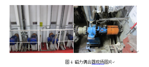 本文所述磁力偶合器已安装在上述FPSO上并开始运行(如图4所示),目前运转情况良好,未见异常情况发生。磁力偶合器安装时,整体尺寸与原膜片联轴器一致,各接口与电机及负载匹配,可直接把电机端与负载端原有膜片联轴器更换为磁力偶合器,无需改动电机、穿墙轴和泵的底座,并且可以提高轴承箱、电机与穿墙轴的使用寿命。磁力偶合器其应用范围广,且安装、操作流程简单,对中要求低,安装时可容忍较大的安装误差,由于是非接触式传动,有效隔离了振动的传递,使得这个传递系统运行稳定,减少了故障的发生频率。同时设备基本免维护,降低工人的劳动强度及节省维护成本。