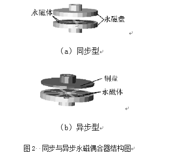 磁力偶合器从原理上可分为两种:一种是同步型;一种为异步型(如图2所示)。同步型磁力偶合器的主动盘与被动盘皆为永磁体盘,两盘永磁体的磁场在气隙中耦合,把磁能转变为机械能,实现传扭。异步型磁力偶合器的主动盘为永磁体,被动盘为铜盘,利用永磁体磁场与感应磁场的相互作用来传扭。