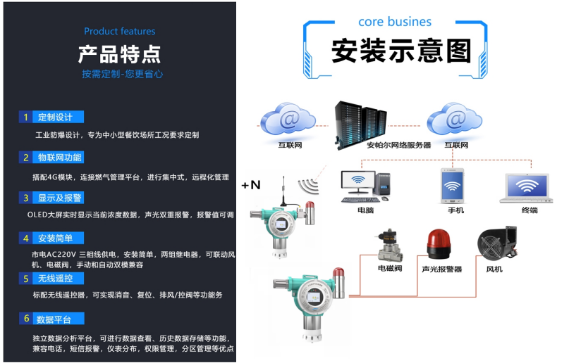 为此安帕尔研发的餐饮场所专用可燃气体报警器可以在有可燃气体管道场景投入使用,全天24小时监测燃气是否泄漏的情况,一旦可燃气体的浓度达到报警设定值,气体探测器将实时发出声光报警信号,并通过电话、短信、微信、各级监管平台进行报警,提醒监管人员迅即采取有效措施,做到燃气事故可防可控,最大限度地减少突发事件可能造成的损失,保护人民的健康和生命安全,确保城市供气安全,从源头遏制灾祸发生。