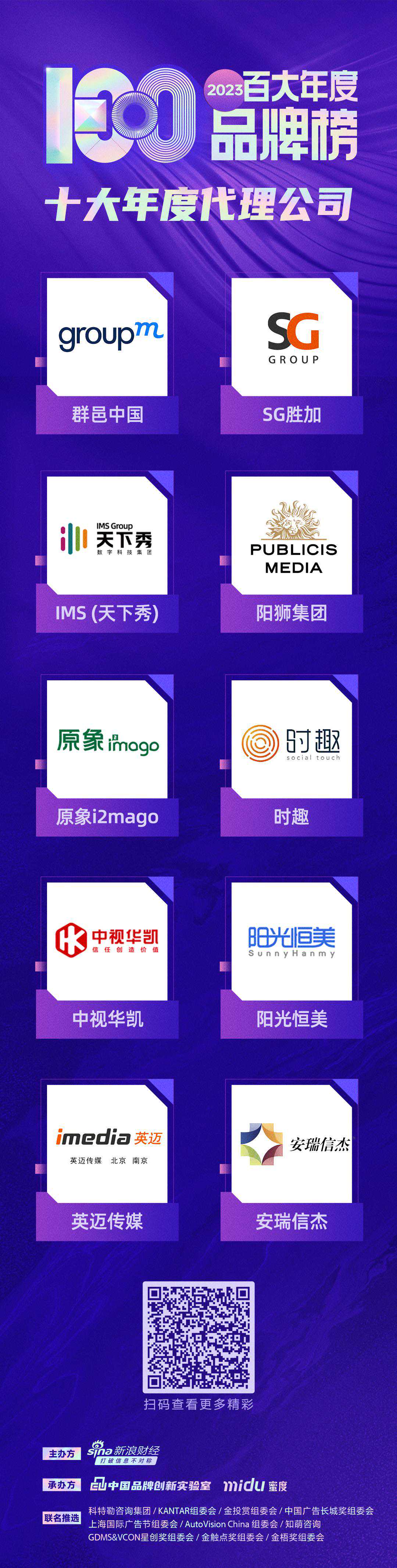 新浪财经和迎驾贡酒联合主办的首届生态品牌论坛暨2023“百大年度品牌榜”颁奖典礼在安徽霍山迎驾山庄举办。现场揭晓2023百大年度品牌榜之十大年度代理公司,他们是:群邑中国、SG胜加、IMS(天下秀)、阳狮集团、原象i2mago、时趣、中视华凯、阳光恒美、英迈传媒、安瑞信杰。以下是全榜单。