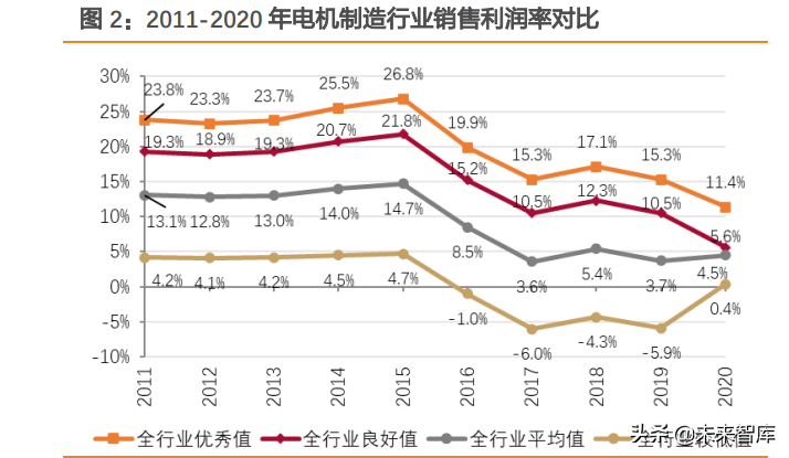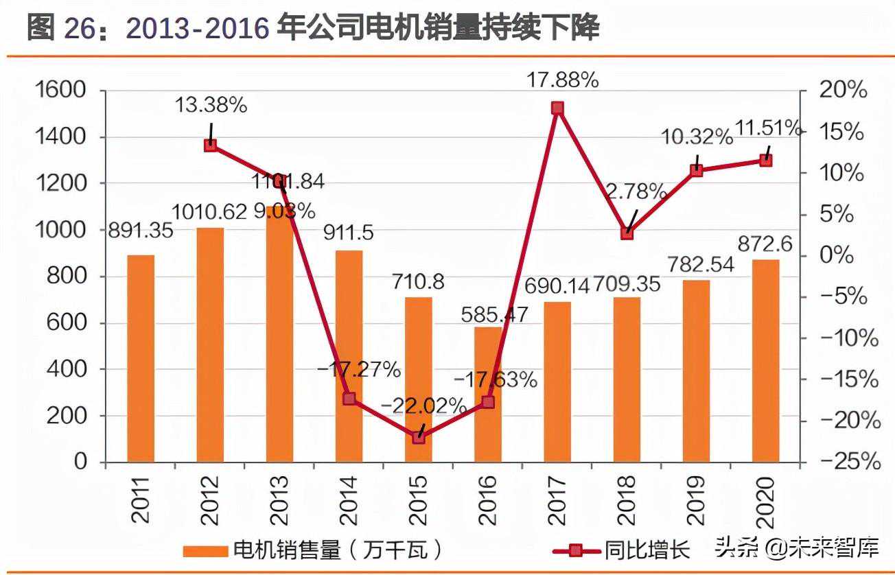 竞争加剧推动落后产能出清,马太效应持续显现。①伴随下游需求稳定+行业竞争加剧,电机制造行业利润率显著下滑,2015-2017年电机制造业销售利润率均值由14.7%下滑至3.6%。同时,2016-2019年行业销售利润较低值连续4年为负,推动落后产能持续出清。②中小型电机行业马太效应显现,在中小型电机行业协会64家企业中,2020年利润总额超过6000万元的企业达17家,较2016年增加6家。