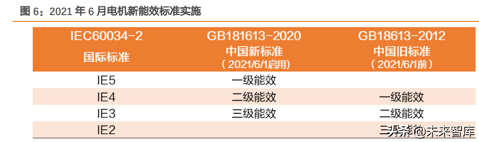 2021年6月电机新国标实施,中国全面进入IE3高效电机时代。电机新国标实施后,IE3效率将成为中国最低的三相异步电动机能效限定值(三级能效),低于IE3能效限定值的三相异步电动机不允许再生产销售。根据中国标准化研究院测算,如果中小型电机效率全部从IE2提升到IE3,全国年节电量可达900亿千瓦时,仅生产过程即可减少5960万吨碳排放。