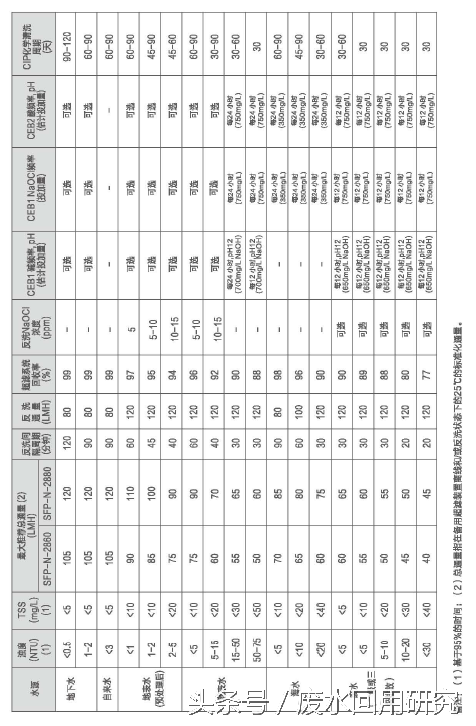 表4-1:SFP-N超滤膜组件在水处理应用中的设计导则(参考,针对具体的项目,需要根据经验和中试试验结果进行优化。)