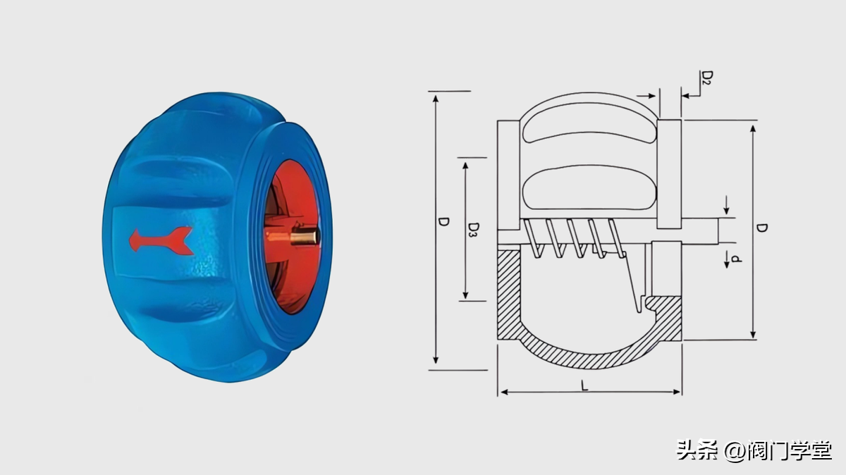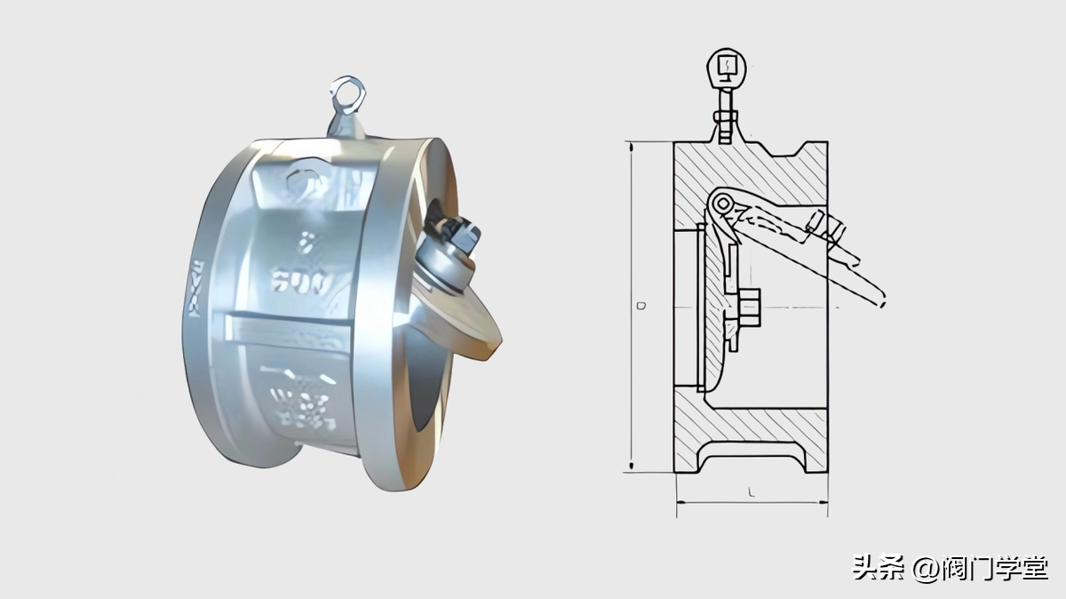 主要由阀体、阀瓣、阀座、扭簧、转轴、等零件组成。其阀瓣由两个半圆阀瓣组成,开启时两个阀瓣对折到一起,关闭时阀瓣形成一个整圆。比单瓣旋启式止回阀关闭更迅速。通径可达DN2000。