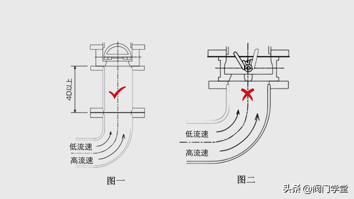 3.在弯管附近安装对夹式止回阀时,直管段距离4倍管径以上。使用双瓣对夹式止回阀时,为使阀瓣能够承受均衡的流速的影响,建议按图一的方法安装。