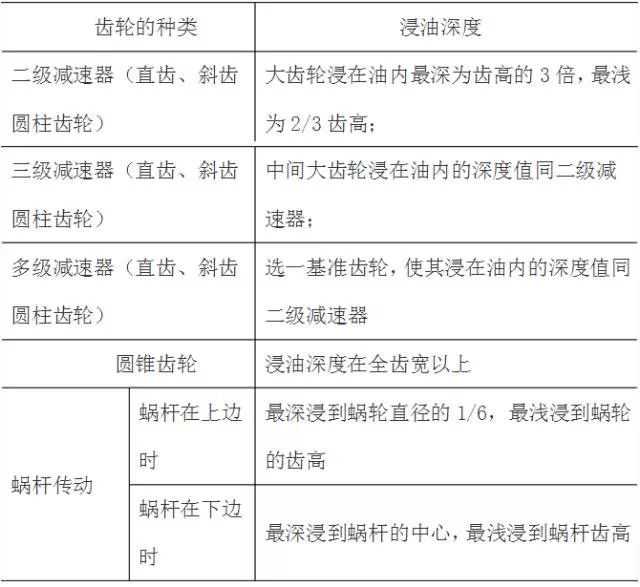 对于采用油裕润滑的减速机浸油量一般规定浸过齿轮全齿高的2~3个为宜,当0.5m/s≤V≤3m/s时浸油的深度为浸过齿轮半径的1/5,对于减速机的浸油量少了有可能造成齿面失油,加速磨损,但也不是越多越好,注油太多,会加大齿轮的搅动力矩,多做功后变成热而使油温升高,同时也会造成减速机各处漏油,给设备维护方面带来很多问题,同时造成设备环境的污染,所以应按规定注入一定量的润滑油,根据减速机不同种类按照该表参考执行:
