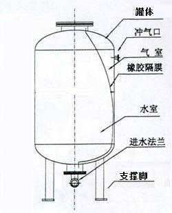 气压罐主要由碳钢罐体,橡胶气囊,充气口,进水法兰,支撑脚五部分组成,如下图: