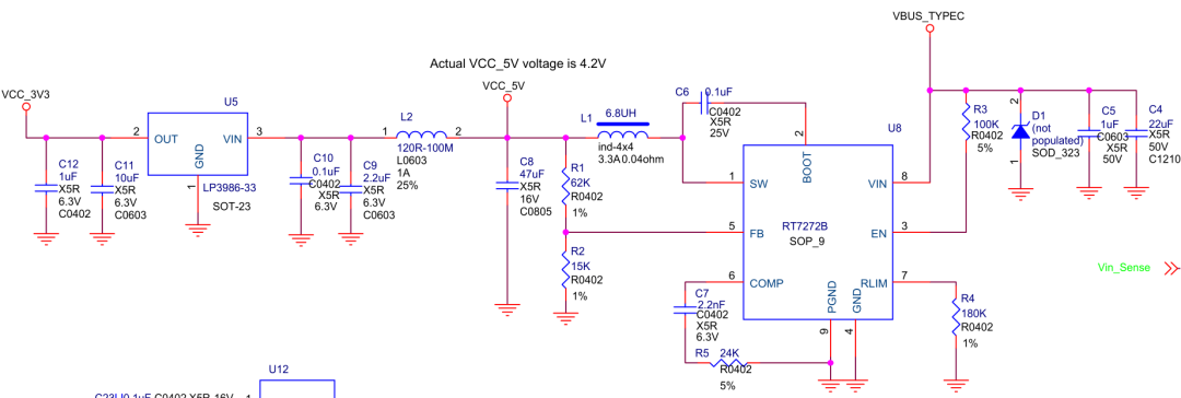 供电部分系统的5V和3.3V供电采用的芯片分别是RT7272B(DC-DC)和LP3986-33(LDO),电路完全按照芯片手册的典型应用电路图接法。其中VUSB_TYPEC就是FUSB302诱骗出来的电压。