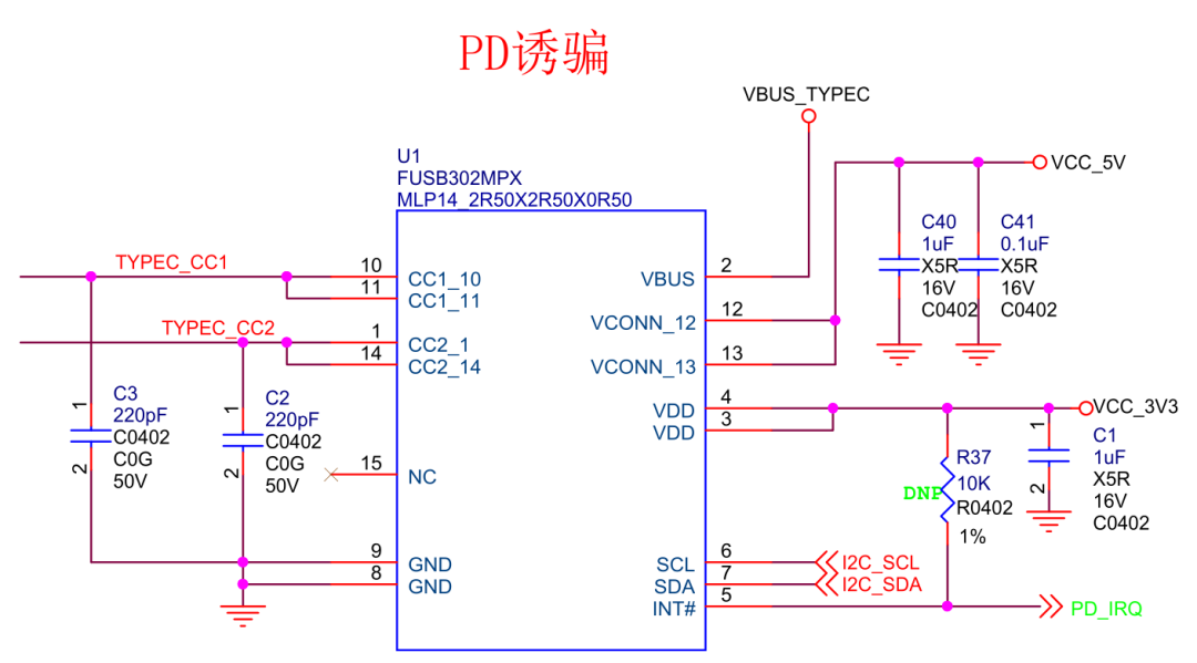 电源部分采用FUSB302芯片进行电压诱骗,当然还有一款用的比较多的诱骗芯片就是CH224。