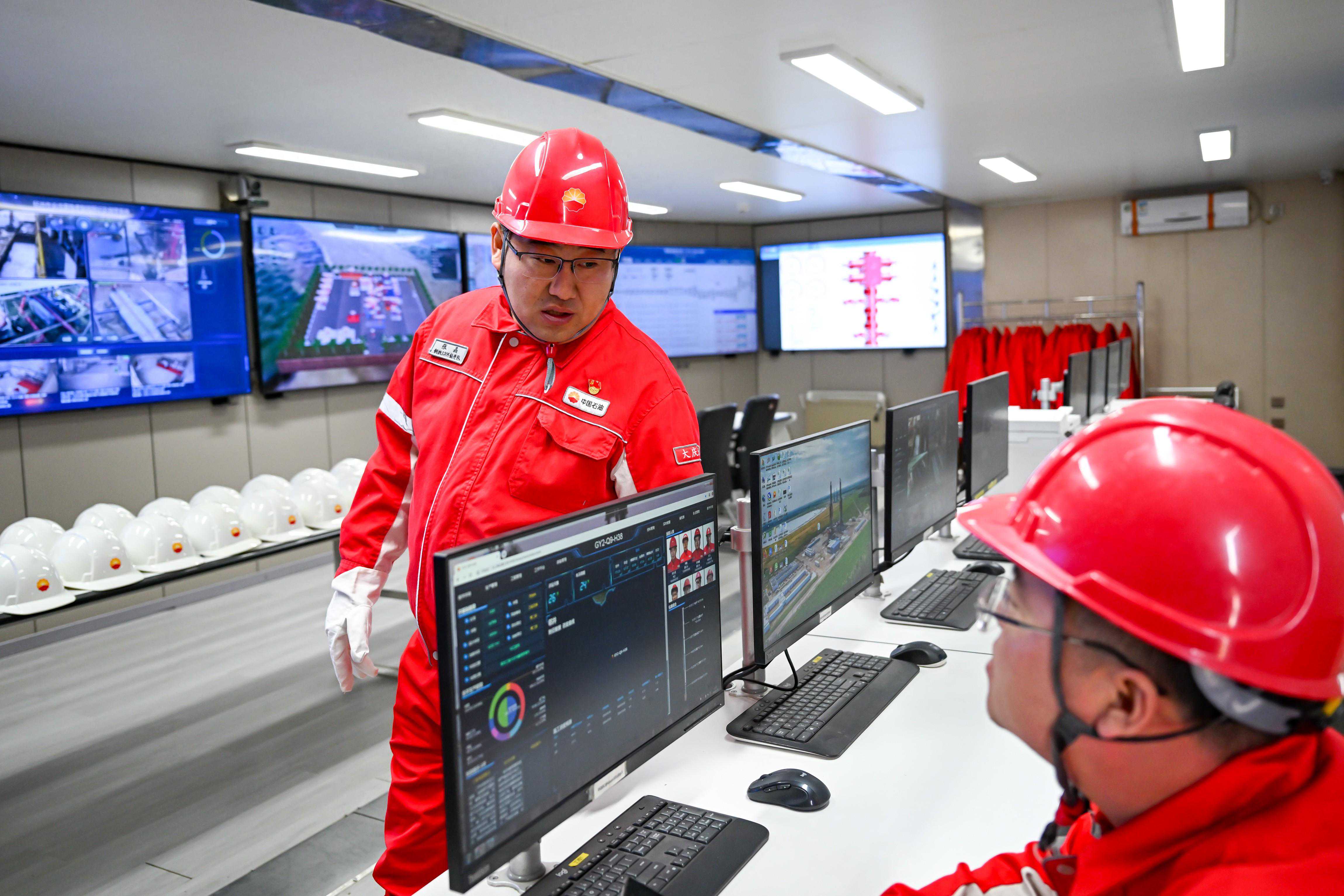 3月28日,1205钻井队队长张晶(左)进行日常巡检。新华社记者张铖摄