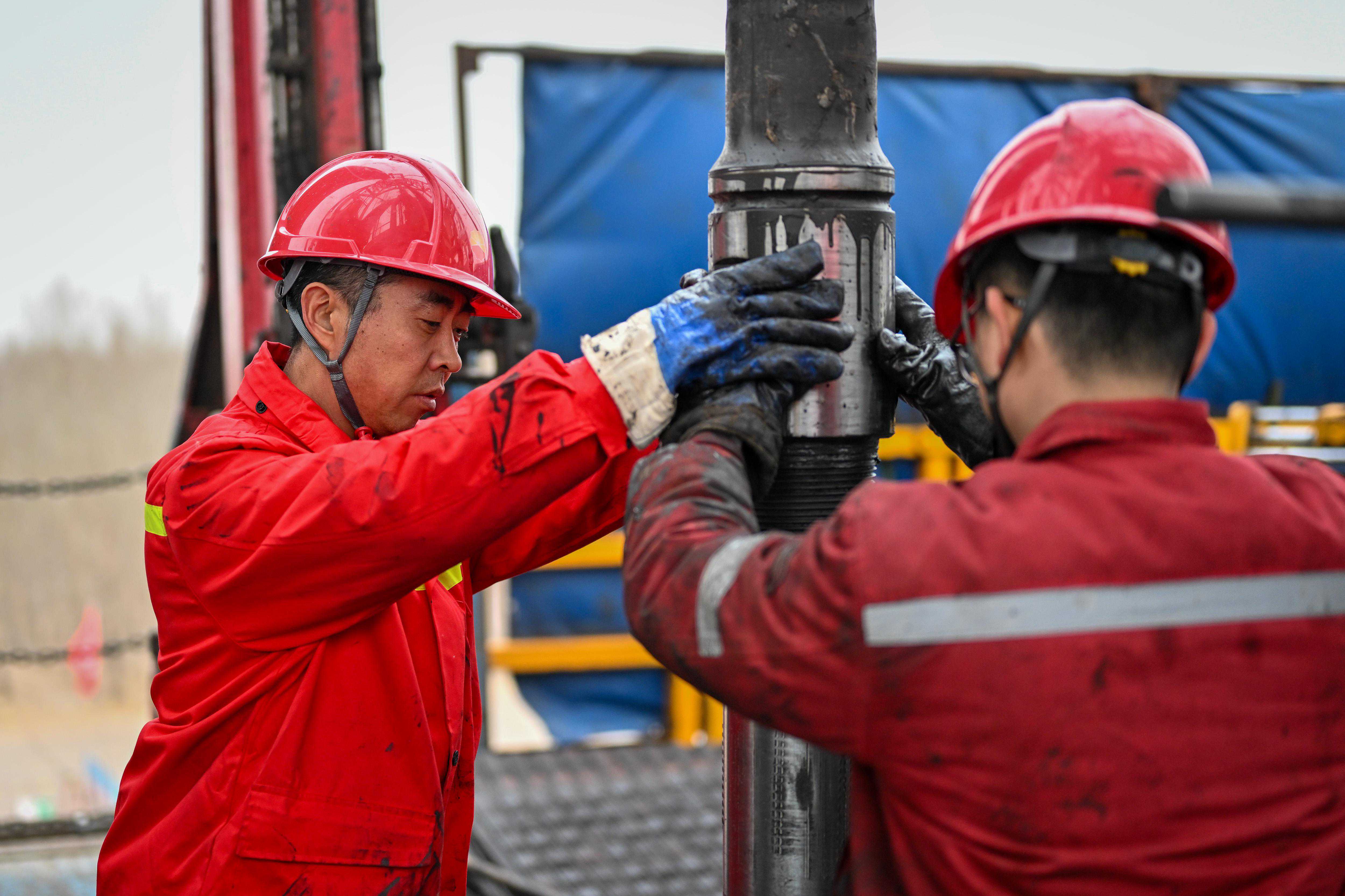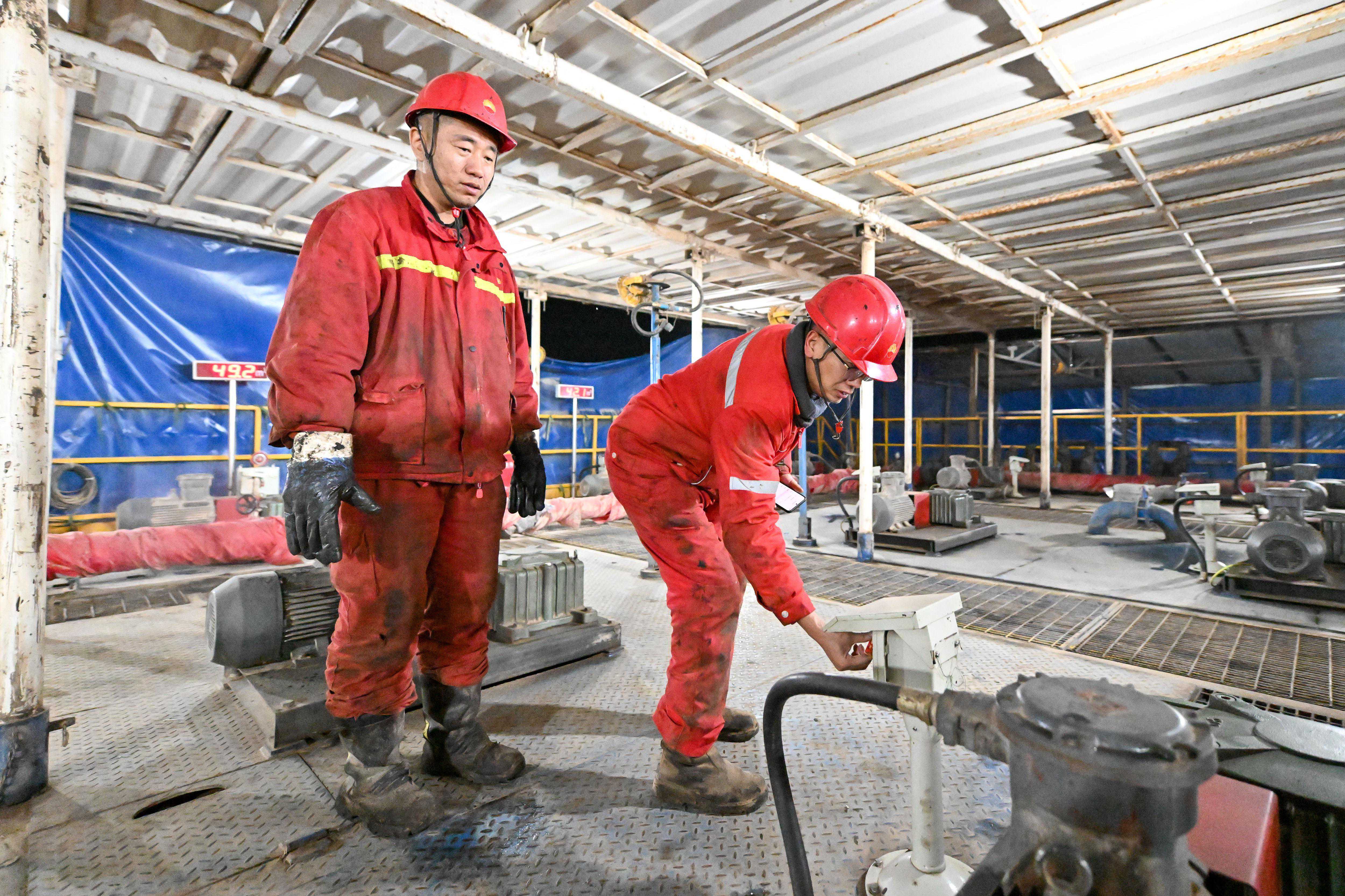 3月27日,1205钻进队泥浆工张彪(右)、梁涛在罐区进行交接班巡检。新华社记者陈益宸摄