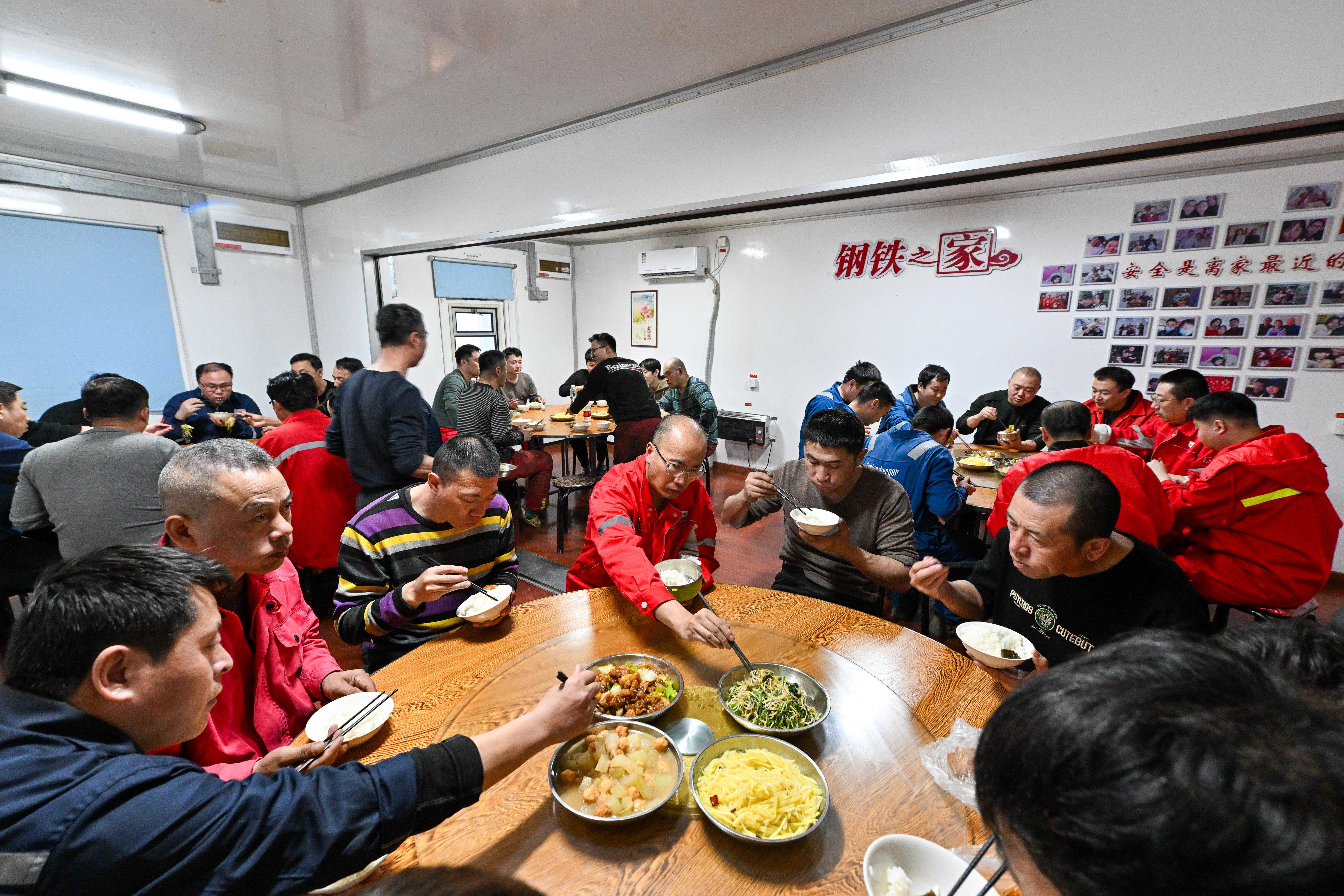 3月27日,1205钻井队的工人们在食堂吃晚饭。新华社记者陈益宸摄