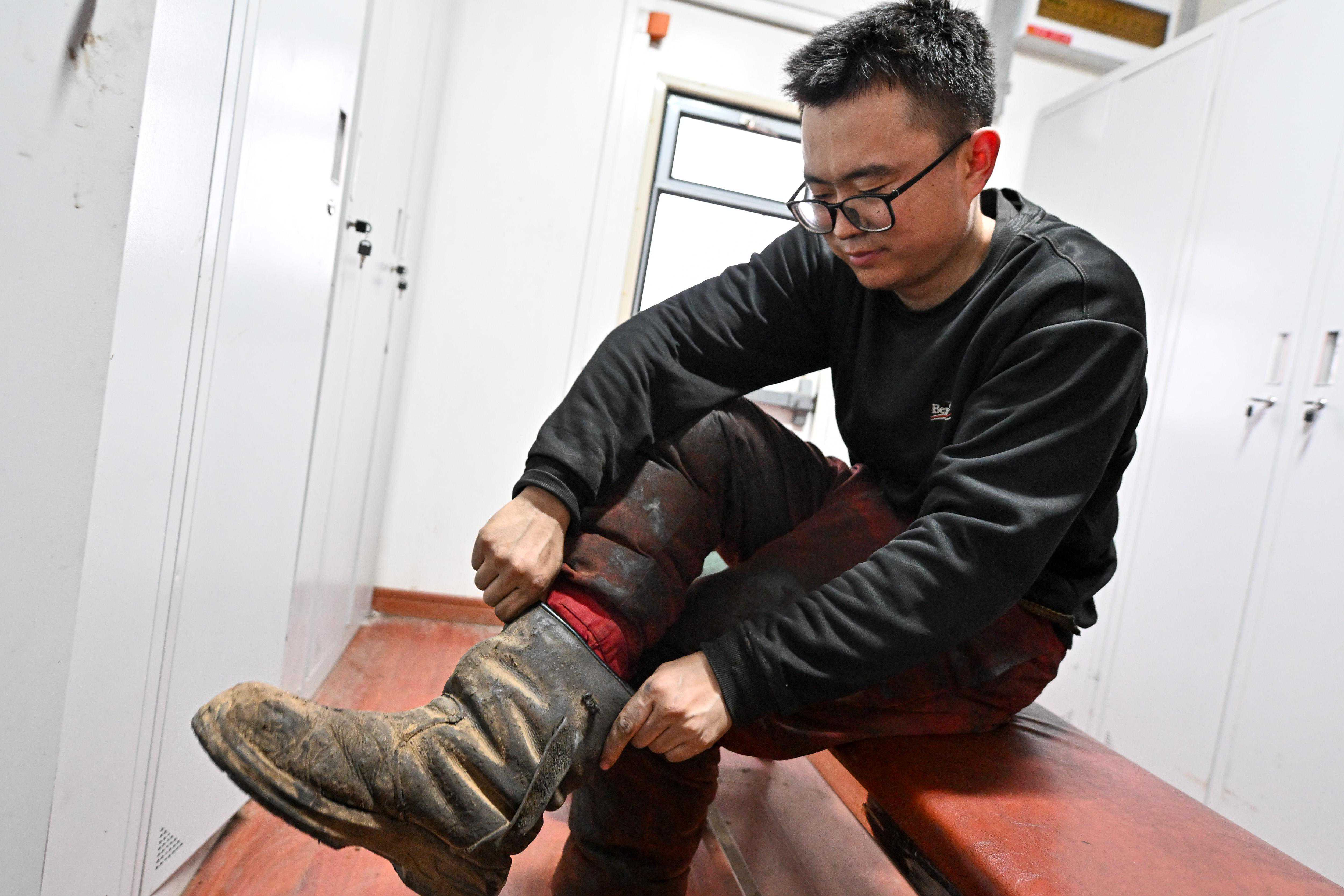 3月27日,1205钻井队外钳工孙诗龙在晚饭后穿上工靴准备继续工作。新华社记者陈益宸摄