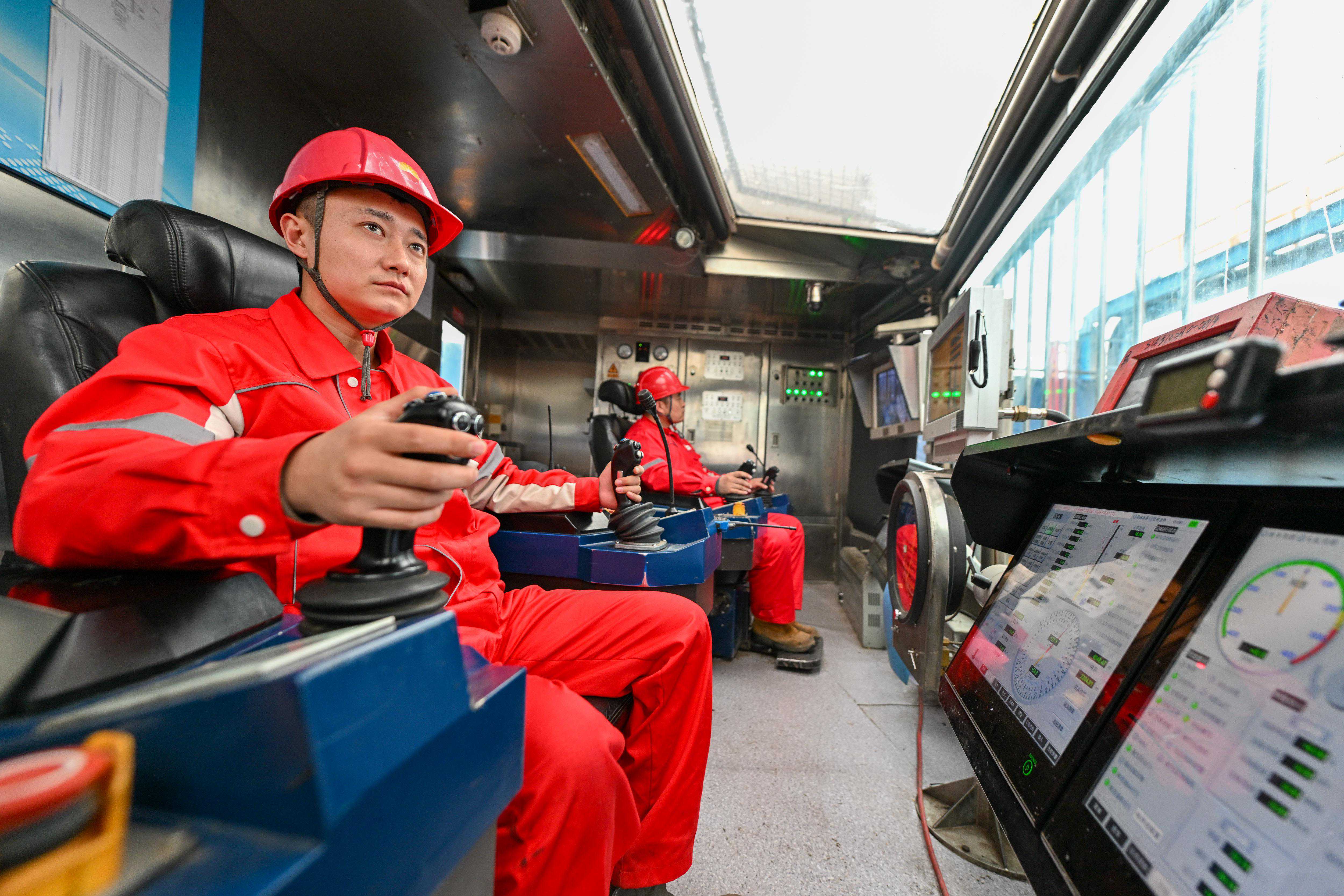 3月27日,1205钻井队司钻葛一凡(左)、于涛操作刹把进行下钻作业。新华社记者陈益宸摄
