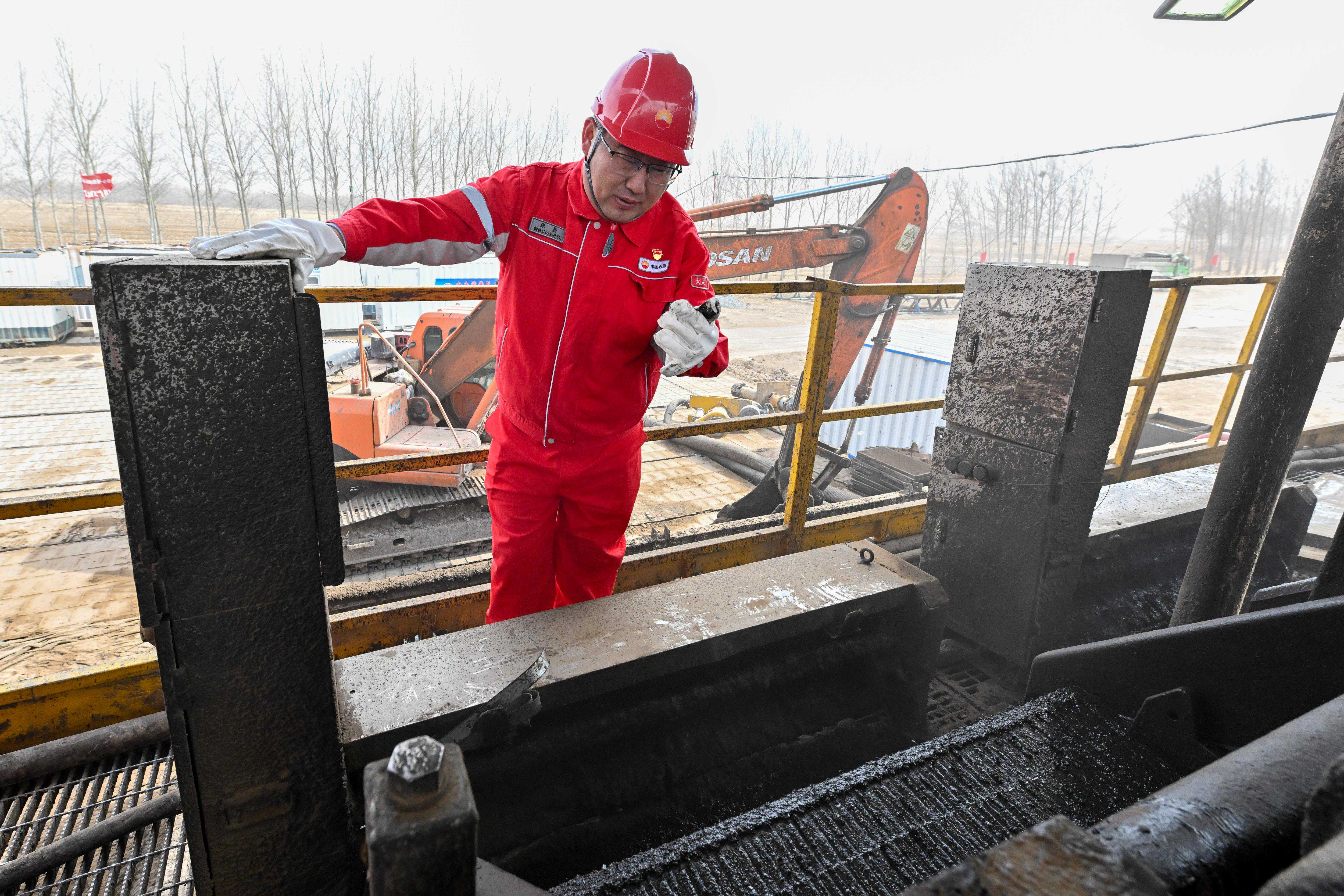 3月28日,1205钻井队队长张晶(左)进行日常巡检中查看振动筛上的岩样。新华社记者陈益宸摄