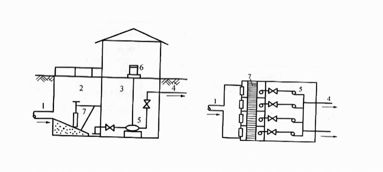 1—排水管渠2—集水池3—机器间4—压水管5—水泵6—格栅