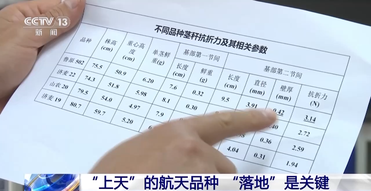 总台央视记者邵海成:大家看到的仪器,叫植物茎秆强度测定仪,是测量植物茎秆抗倒伏能力的仪器。大家看一下这组数据,这里有四个小麦品种,其中鲁原502茎秆抗折力达到了3.14牛顿,是四个小麦品种里抗折力最高的品种。
