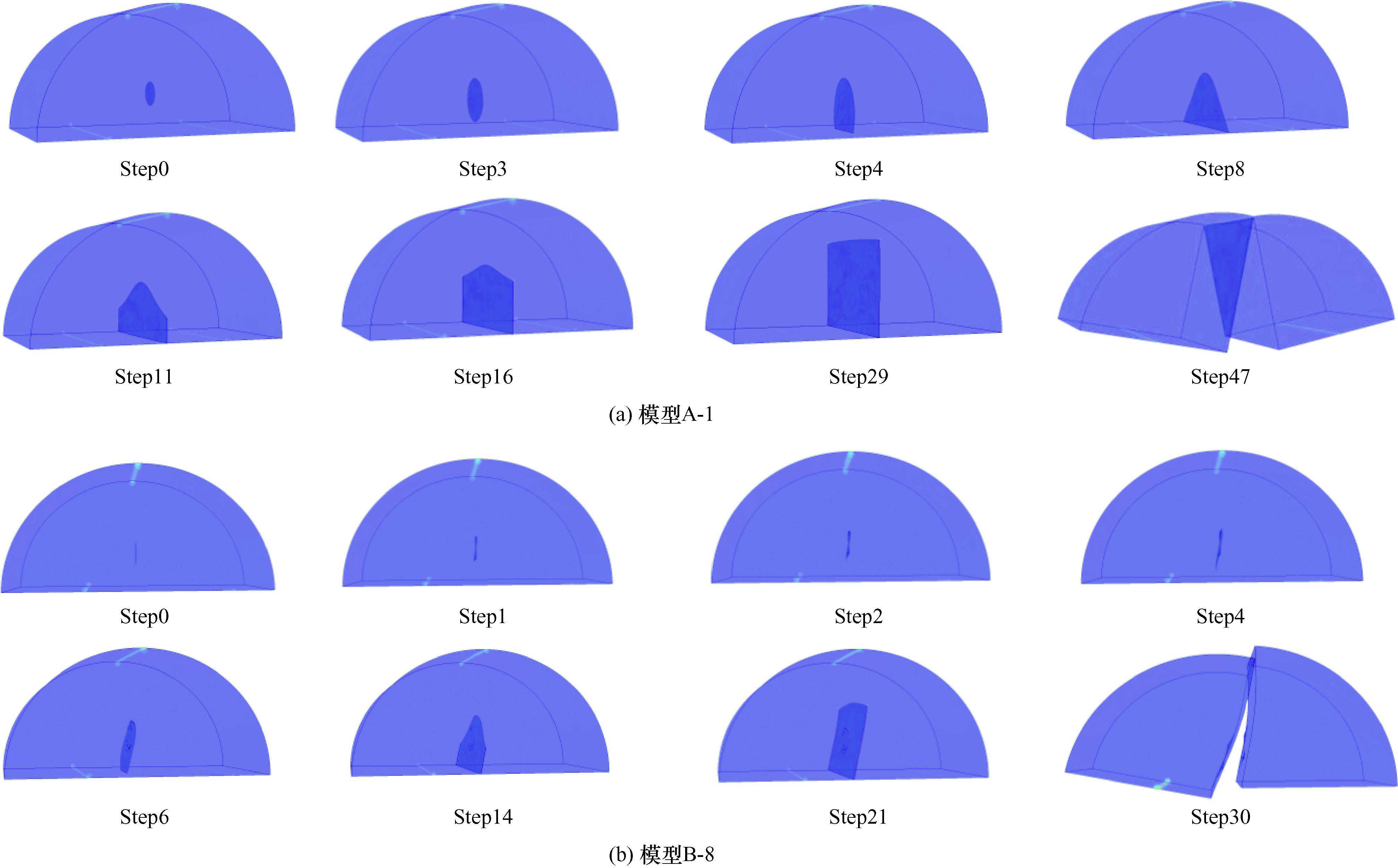 通过观察两个模型内裂纹扩展路径及破坏过程,得到规律如下: