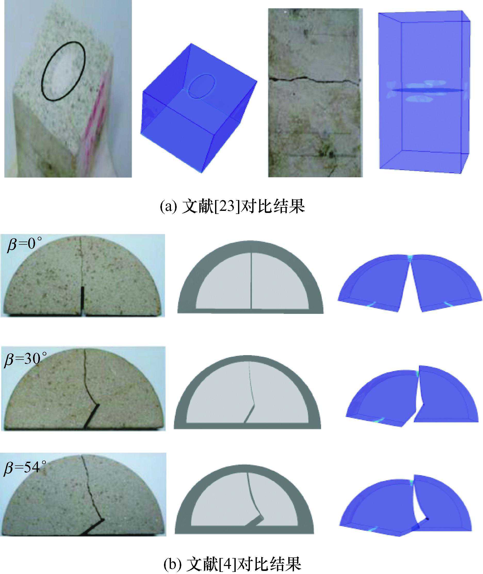 在进行数值模拟之前,首先开展Franc3D软件进行任意裂纹扩展路径模拟的准确性验证。为验证纯内裂纹径的合理性,首先对比文献[23],建立单轴拉伸下含水平内裂纹模型,数值模拟结果证明Franc3D在三维内裂纹扩的一致性。为验证本研究建模的正确性,基于ABAQUS初始模型,利用Franc3D分别对β=0°、β=30°、β=54°三切口角度的砂岩SCB试样进行建模,数值模拟结果与文献[4]具有较好的一致性。综上可知,在确保数值模型正提下,Franc3D可准确模拟三维内裂纹在三点弯拉下扩展断裂的全过程。数值模拟与室内试验结果如图4所示。