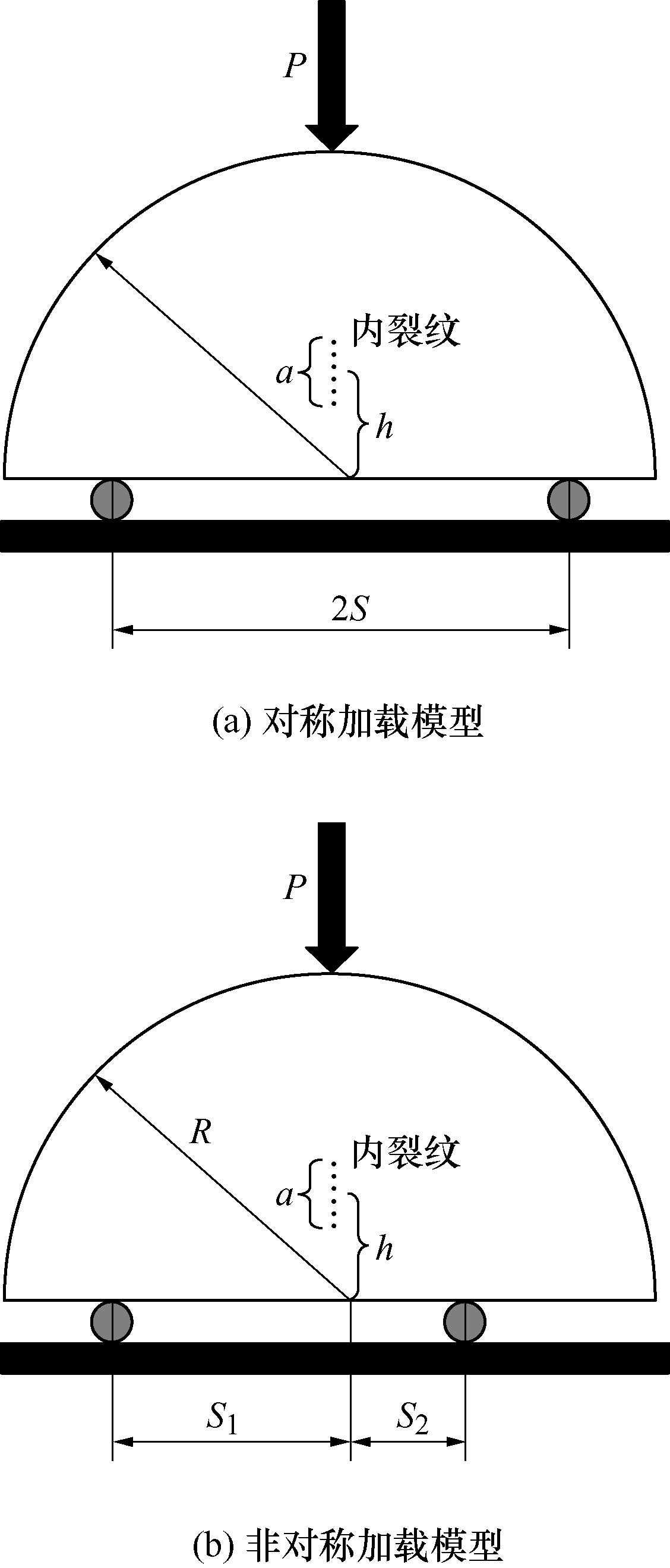 本文建立两组含三维内裂纹模型如图2所示。试件为半圆状,半径R为50mm,厚度t为50mm。内裂纹形状特征尺寸a为10mm。内裂纹深度h为15.0mm。其中2S为底部加载跨距,S为左侧加载跨距,S为右侧加载跨