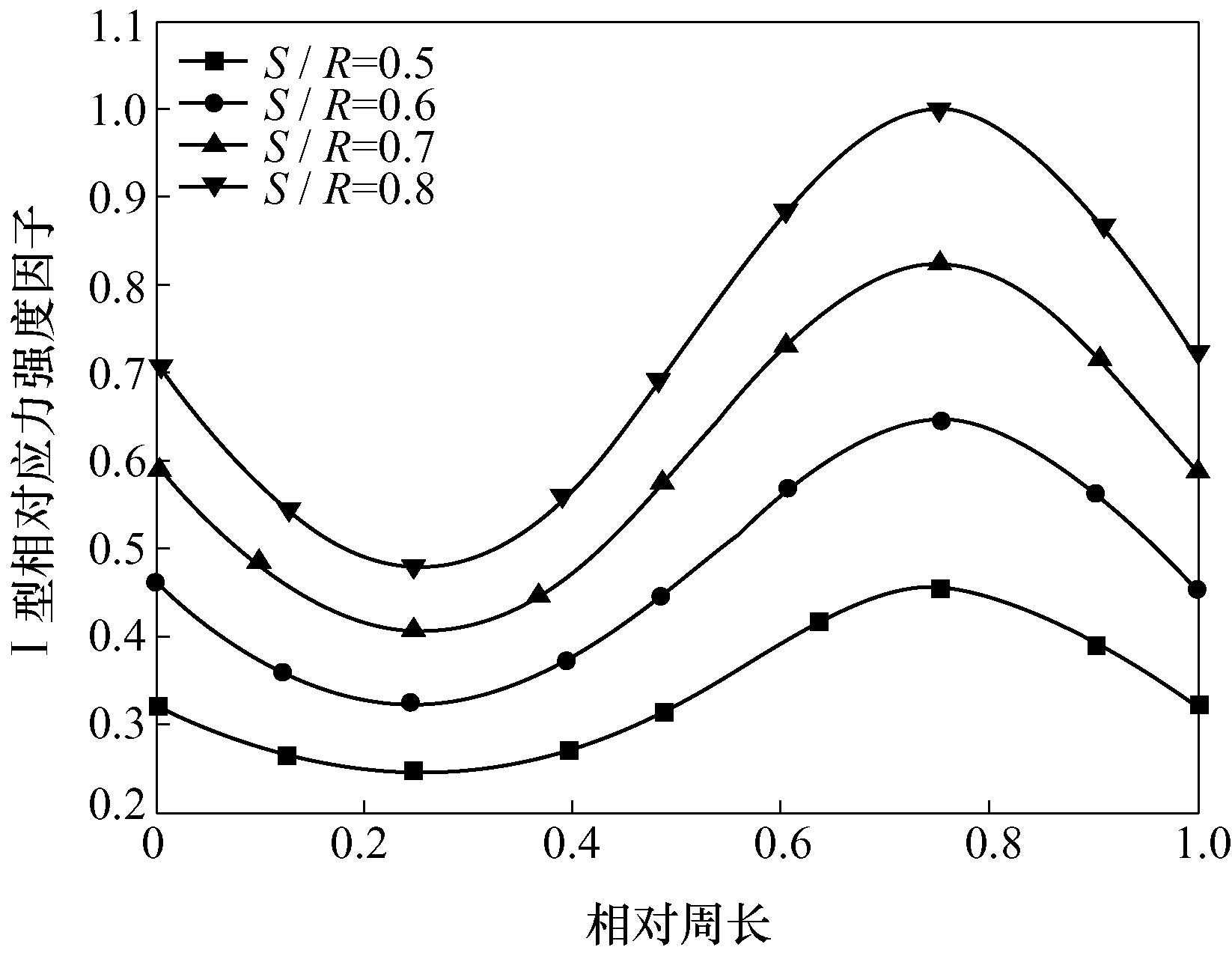 (4)通过图8(c)可知,与Ⅱ作用类似,随着S/R的增加,Ⅲ型作用先变化至0,再逐渐升高。该组所有模型中,Ⅲ裂纹尖端相对周长0、0.5、1.0附近处达到峰值。