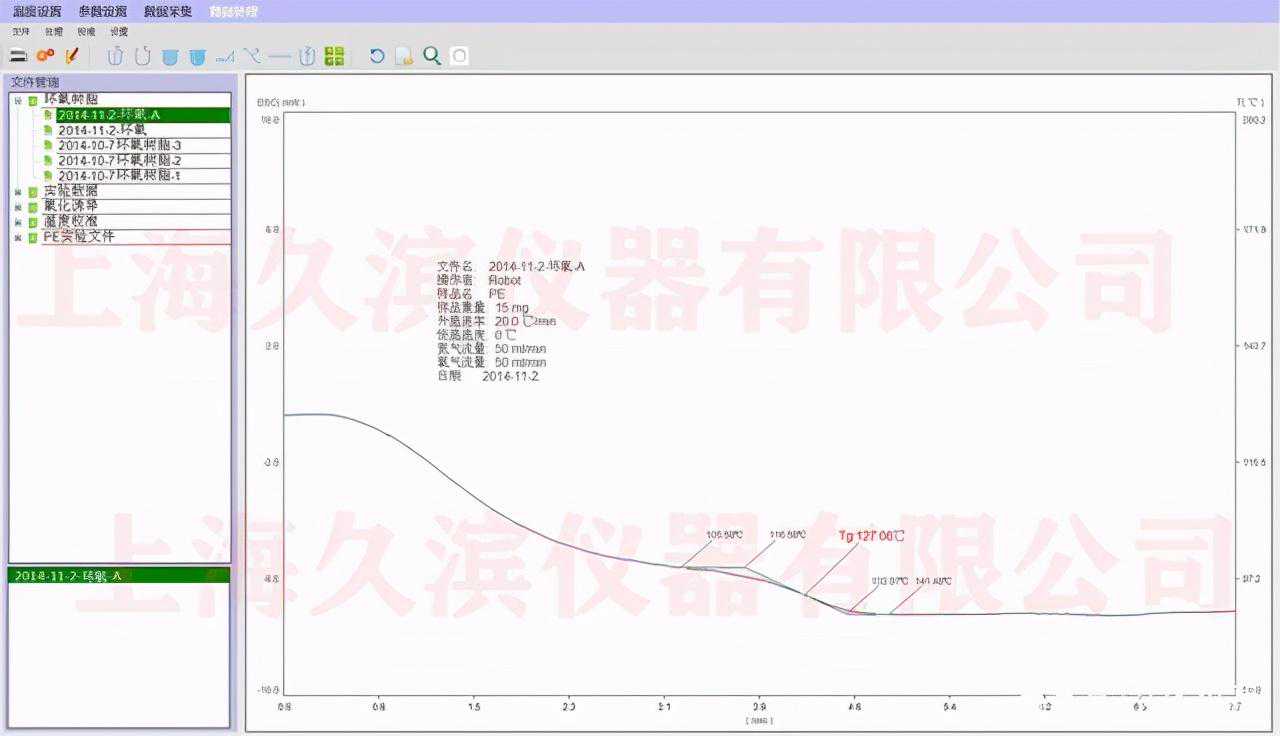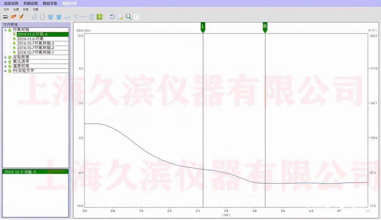 8、微机数据处理系统:数据曲线的采集、存储、屏幕显示及结果报告:温度的标定和校正、外延起始点温度、焓变量、玻璃化转变温度、焓变比率(反应转化率)、以及氧化诱导期处理等。