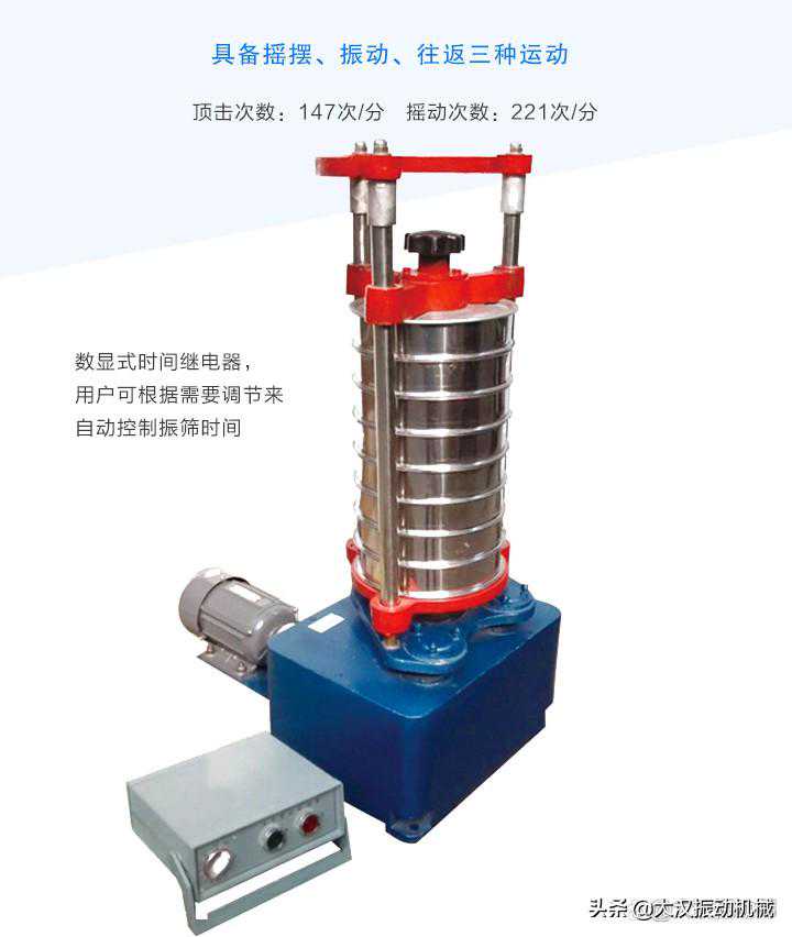 顶击式振筛机简称顶击筛,配套试验筛规格为¢200mm或300mm,采用偏心原理,使机器台面有规律的振动以及撞击,下料快,不易堵塞。具有时间标准、强度和频率统一的优点,以达到良好的筛选效果。