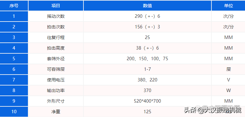 下面是拍击式振筛机的参数配置: