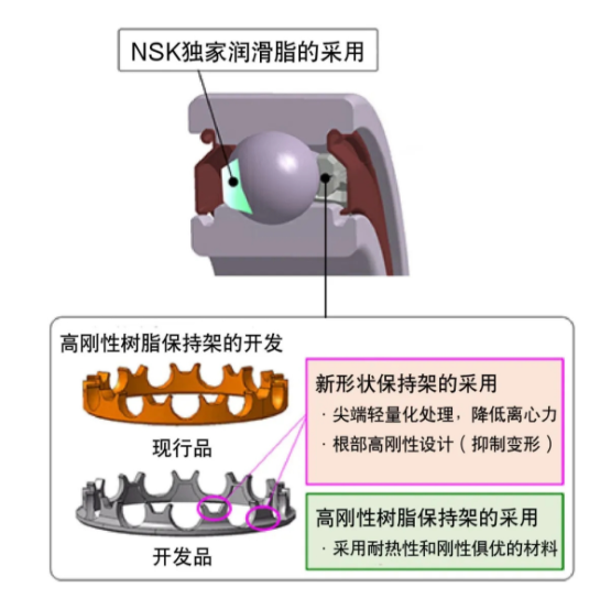 近年来,随着电动车驱动系统的小型化、轻量化,以及驱动电机高效率化的市场需求不断加大,对驱动电机支撑用球轴承提出了更高转速的要求。球轴承在高转速旋转工况下,由于发热的影响,会发生润滑不良导致咬粘;另外,由于离心力的影响,保持架变形而发生破损也是亟待解决的课题。