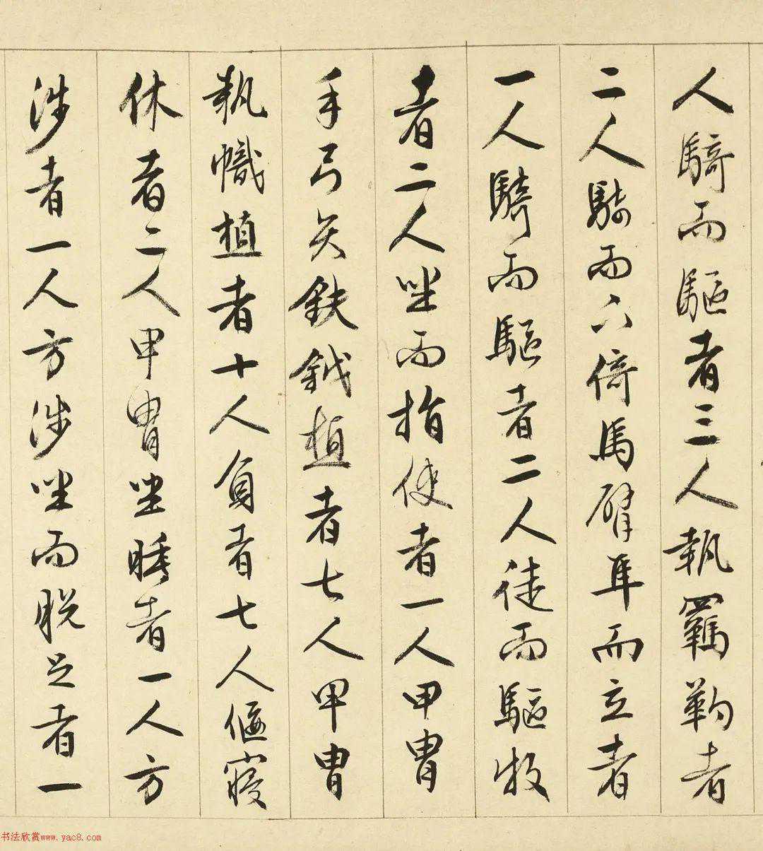 畫記。雜古今人物小畫共一卷。騎而立者五人。騎而被甲載兵者十人。一人騎執大旗前立。騎而被甲載兵者(點去)行且下牽者十人。騎且負者二人。騎執器者二人。騎擁田犬者一人。騎而牽者二人。騎而驅者三人。執羈靮者二人。騎而下倚馬臂隼而立者一人。騎而驅者二人。徒而驅牧者二人。坐而指使者一人。甲冑手弓矢鈇鉞植者七人。甲冑執幟植者十人。負者七人。偃寢休者二人。甲冑坐睡者一人。方涉者一人。方涉坐而脫足者一人。寒附者一人。雜執物役者八人。奉壺矢者一人。舍而具食者二十有一人。挹且注者四人。牛牽者三人。驢驅者四人。一杖而負者。婦人孺子載而可見者六人。載而上下者三人。孺子戲者九人。凡人之主事三十有二焉。人大小百二十有三而莫有同者焉。馬大者九匹。於馬之中又有上者下者焉。行者牽者。奔者涉者。陸者翹者。顧者鳴者。寢者訛者。立者齕者。飲者溲者。陟者降者。痒磨樹者。噓者嗅者。喜而相戲者。怒相踶齧者。秣者騎者。驟者走者。載服物者。載狐兔者。凡馬之事二十有七焉。馬大小八十有三而莫有同者焉。牛大小十一頭。駱駝三頭。驢如駱駝之數。而加其一焉。隼一。犬羊狐兔麋鹿共三十。旃車三兩。雜兵器弓矢旌旗刀劍矛楯弓服矢房甲冑之屬。缾盂簦笠筐筥錡釜飲食服用之器。壺矢博奕之具。二百五十有一。皆曲極其妙。貞元甲戌年。余在京師甚無事。同居有獨孤生申叔者。始得此畫。而與余彈?。余勝而獲焉。意甚惜之。以為非一工人之所能運思。蓋藂集眾工人之所長耳。雖百金不願易也。明年出京師至河陽。與二三客論品格。因出而觀之。座有趙侍御者。君子人也。見之蹙然若有感。少而進曰。噫。余手之摹也。亡之且二十年。余少常有志乎茲事。得國本。絕人事而摹得之。遊閩中而喪焉。居閒處獨時。往日來余懷也。以其始為之勞。而夙好之篤也。今雖遇之。力不能為已。且命工人存其大都焉。余既甚愛之。又感趙君之事。因以贈之。而記其人物之形狀與數。而時觀之以自釋焉。