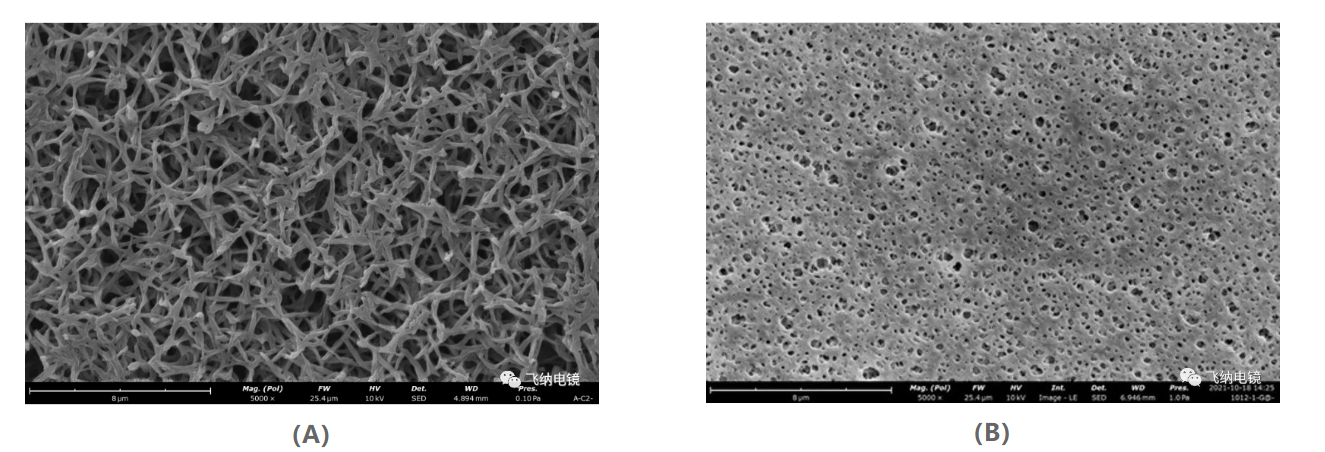滤膜的过滤性能对各制程、产品质量有很大影响,利用飞纳台式扫描电镜可以快捷地获取滤膜的SEM表征结果,对滤膜的孔径和孔道形貌、分布进行分析。如下图(A)、(B)所示为典型的尼龙滤膜和聚醚砜滤膜的表面孔洞结构,通过扫描电镜(SEM)图可以清晰地观察孔洞的形态和分布状态,并对滤膜的孔径进行测量统计。