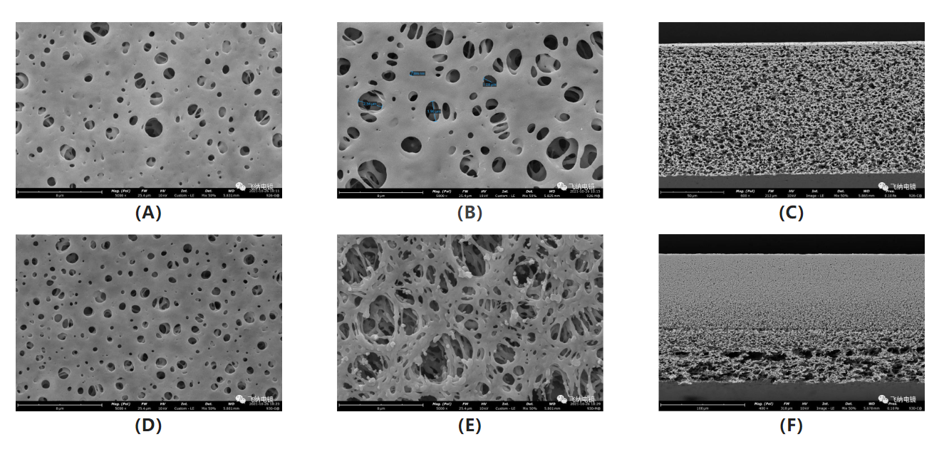 在实际应用中,为兼顾滤膜的能力和效率,在滤膜结构上通常会有一些特殊的设计。如下图(A)~(C)所示为一种不对称膜,(A)、(B)所示分别为其正背面,两面的孔洞结构不同,滤膜内部孔洞较大,表层薄而细小的孔决定了膜的截留率,下层的大孔可以保证滤膜的通量和过滤速度。(D)~(F)所示为一种具有梯度微孔结构的滤膜,从上至下孔洞尺寸逐渐增大,断面结构表现为上密下疏,能够实现超低压下的过滤、大通量产水。