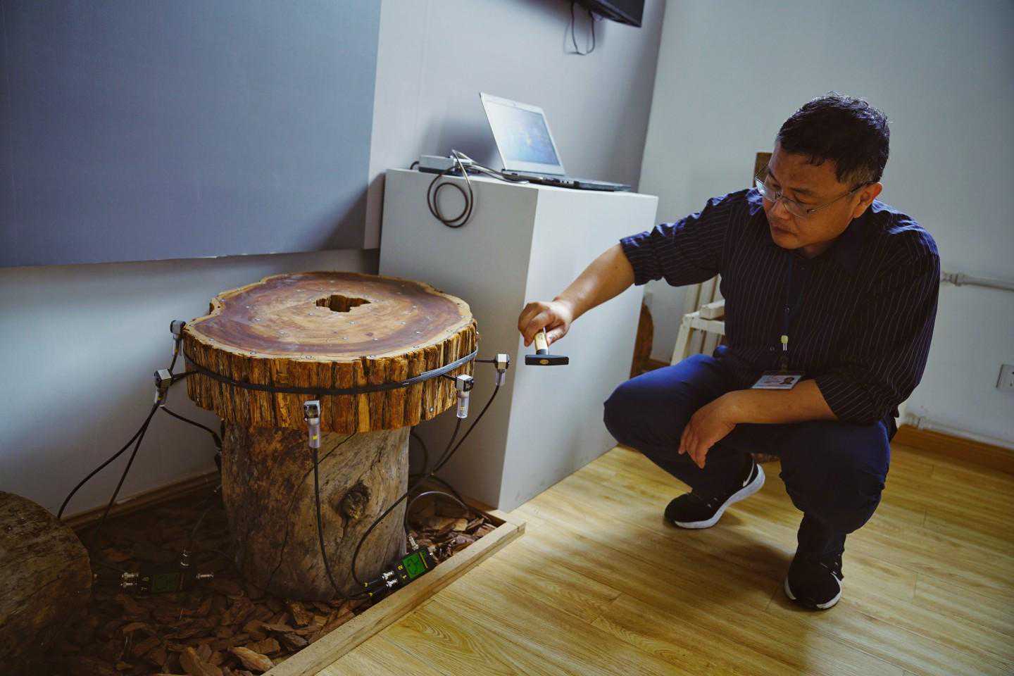 “看诊”结束,巢阳开始“听诊”,他用皮锥敲击树干,存在空腐结构的树干会发出与正常健康的树干不同的声音,称为“异常音”。如果树干下方有空腐情况,上面是“实心”健康树干,则树体折断或倒伏的风险更大。