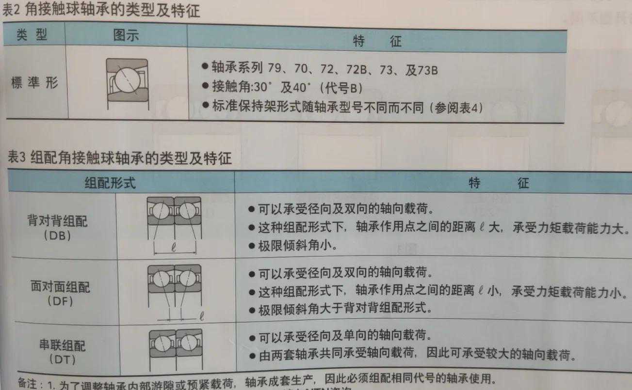 角接触球轴承可以承受径向载荷和单向轴向载荷。且,径向载荷作用时派生轴向分力,因此,角接触球轴承一般都是成对相向应用。表列出了角接触球轴承的特征,而表则列出了组配角接触球轴承的特征。