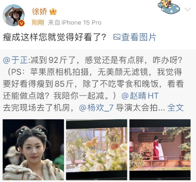 白幼瘦审美的背后,隐藏着男权社会对女性的凝视和控制。于正定下女演员身材标准“要减到85斤才好看。”在这种审美观念下,女性被物化为男性的审美对象,这种客体化的地位导致女性主体意识的丧失,她们在不知不觉中接受并遵循外来的规训和自我规训。这种审美标准不仅加剧了女性的身体焦虑,还可能导致心理健康问题,多位女演员因减肥而患上疾病。
