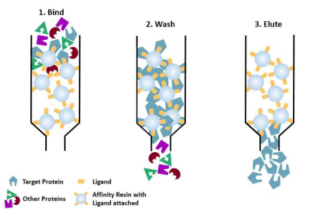 是一种通过分子间的特异性识别和相互作用来分离纯化物质的层析方法。目的分子与偶联有亲和试剂的层析柱结合,而所有或绝大多数其他分子因不能与之结合而流出柱子,然后用干扰这种特异性结合的溶液将目的分子从柱上洗脱下来。亲和层析技术可以利用配基(在亲和层析中起可逆结合的特异性物质)与生物之间的特异性吸附来分离蛋白,也可以在蛋白上加入标签,利用标签与配基的特异性结合来纯化蛋白。