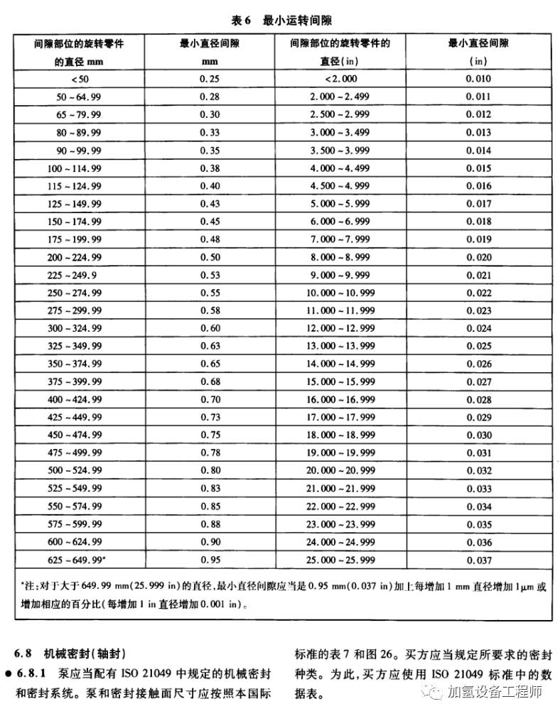 b)对于铸铁青铜经硬化处理的马氏体不锈钢以及具有类似低咬合趋势的材料,应采用表6中所列的最小间隙。对于咬合趋势较大的材料和工作温度大于260C(500下)的各种材料,应当在上述直径间隙上再加125um(0.005in)。