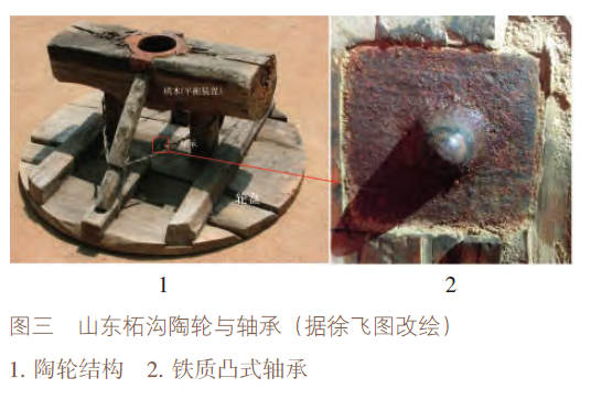陶轮盘筑修坯与拉坯工艺同时得到了民族学材料的佐证。云南西双版纳景洪傣族陶工使用慢轮盘筑修坯技术制作陶器,慢轮为单轮盘,主要用脚推动,轮盘面大底小,底部设孔用以嵌入立于地面的木柱(或竹竿),轮盘转速为每分钟4~6转[37]。(图二:6)陶器的成型过程全部在慢轮上完成,首先在轮盘上通过圈筑法制作筒状雏形,再结合刮、抹及拍打等工序修坯成型。索马里兰盖力卜(Gelib)陶工使用的榫卯式慢轮由木质轮盘和底座构成,底座低矮,高3.5厘米,下部埋于地下,上部呈半球状,同轮盘中部的凹槽套接,使用时以脚推动。(图二:5)轮盘直径28.7厘米,重量轻,转动惯量小,轮盘与底座的接触面积大,摩擦阻力大,不易维持轮盘的转动动能,仅适用于盘筑修坯工艺[38]。彭小军博士总结山东即墨西城汇、莒南县薛家窑、泗水柘沟、广西靖西念者屯、云南西双版纳曼郎、曼海等地有关“泥条拉坯成型技术”的民族学材料,发现其多使用有轴陶轮,在粘接泥条步骤借助转动动能提拉坯体制成陶器雏形,待坯体含水量降低之后通过刮或拍打的方式保证泥条紧密连接,并同时实现减薄器壁,调整器形的目的[39]。所使用的陶轮既有慢轮也有快轮,如广西靖西龙腾中屯壮族陶工所使用的“转”与西双版纳曼海寨傣族陶工所使用的“木轮”皆为慢轮(图二:4、6),而西城汇与泗水柘沟明确使用铁质圆锥状突起作为轴承连接轮盘与中轴,应为快轮装置[40]。(图三)
