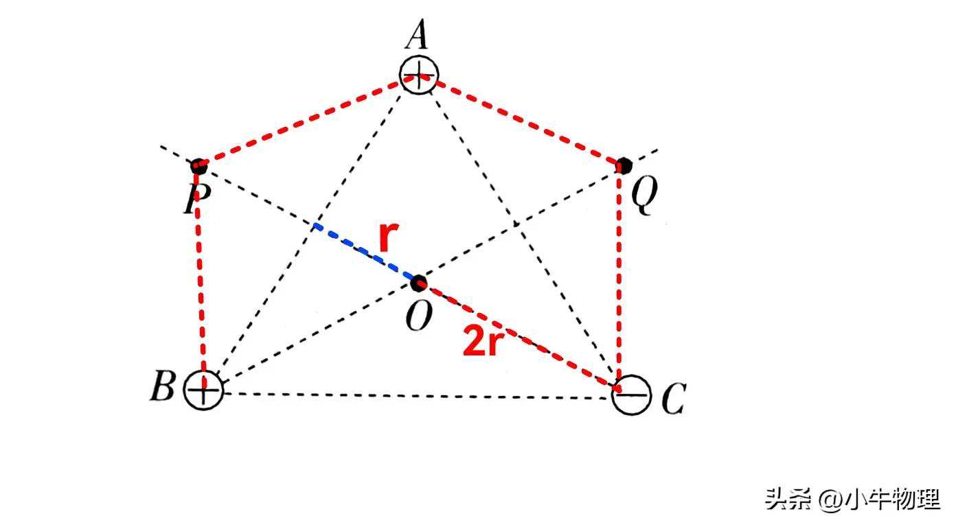 在正三角形ABC的三个顶点A、B、C处分别固定电荷量为+q、+q、-q的点电荷,O为正三角形的中心,Q为BO延长线上一点,O、Q关于AC边对称,P为CO延长线上一点,O、P关于AB边对称,下列说法正确的是()