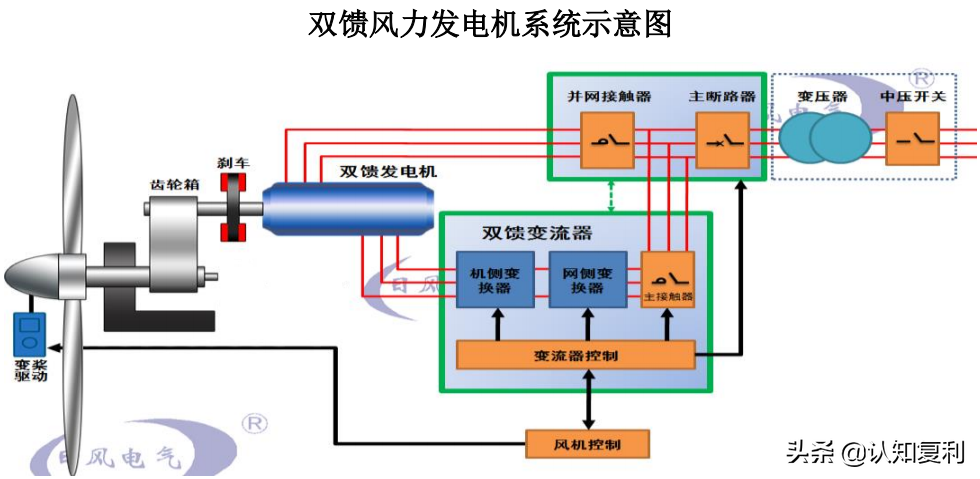 常见的火电发电机组使用直流励磁同步发电机,直流励磁的磁场固定不变,通过调节涡轮转速来控制发电频率。但风机转速不可控,需生成一个与风机转速相差50Hz的旋转磁场,才能保证发出50Hz的交流电实现并网,因此,使用交流励磁。