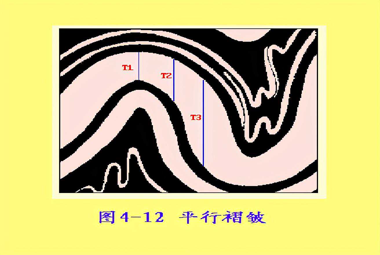 即在同一个剖面中,硬性岩层形成平行褶曲,韧性岩层形成相似褶曲。